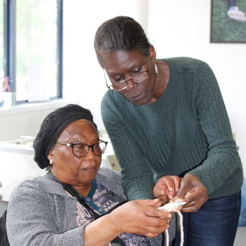 Cynthia, who volunteers every week to teach the ladies how to knit, began knitting at 17. Although she only knew the basics at the time, she was knitting and pearling, eventually teaching herself to knit all sorts of things. “I would get frustrated at times. But if you like doing the thing, you know, you don’t give up; you stick with it.”